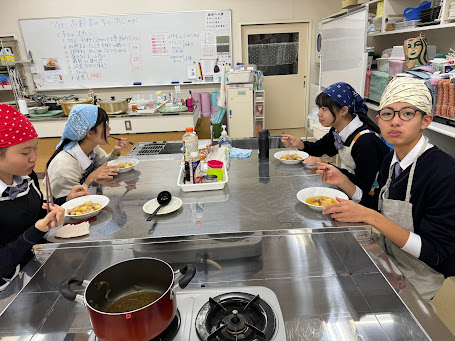 2学期最後の実習はコロナ禍では1度もしていなかった調理実習を行いました。中3の保育分野の学習の中の幼児期までの栄養の学習のまとめとして「おやつ実習(パンケーキ)」を行いました。事前にパンケーキのデザインを描き、パンケーキを作る際は保育者として、試食時は幼児になりきって食べようという実習です。私も生徒もドキドキワクワクしながら実習を楽しみました。